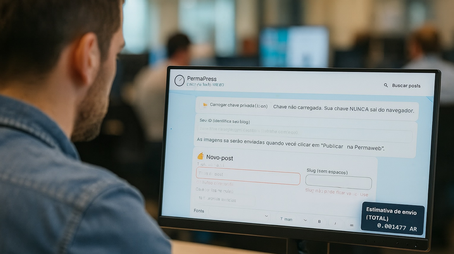 • Estimativa de custo em tempo real: mostra o total estimado de AR (e conversões para USD/BRL) considerando corpo do post, HTML opcional e todas as imagens anexadas.